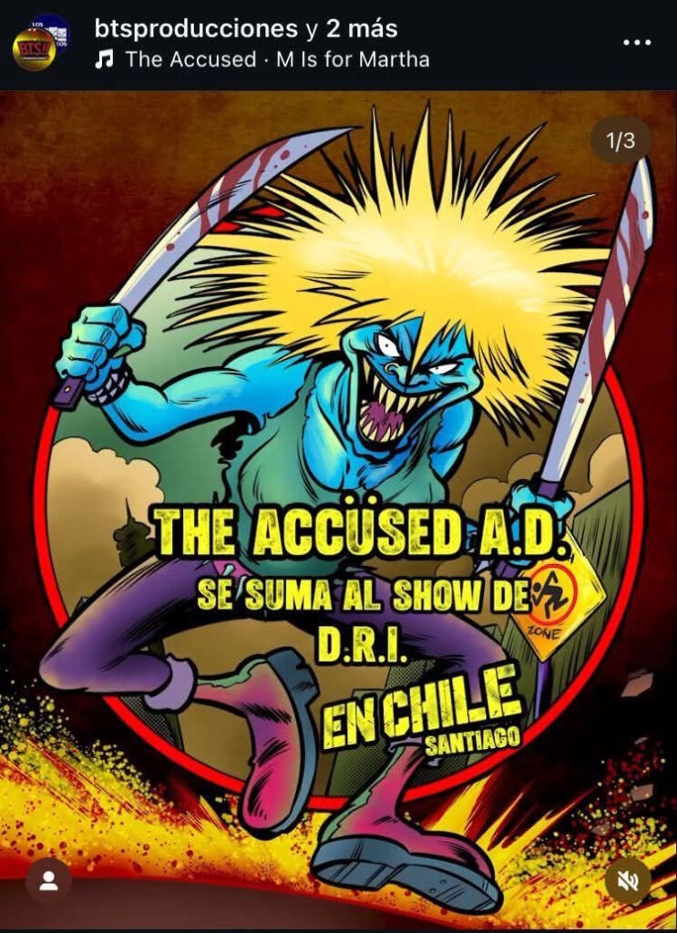 MARCH 12-13th RETURN TO CHILE! with Thrash Masters D.R.I.! Tickets 3/12 Concepción! Tickets 3/13 Santiago! Accüsed AD Toe Tag CANADA! May 8 -9th Edmonton & Calgary Tickets 5/8 Edmonton! Tickets 5/9 Calgary!